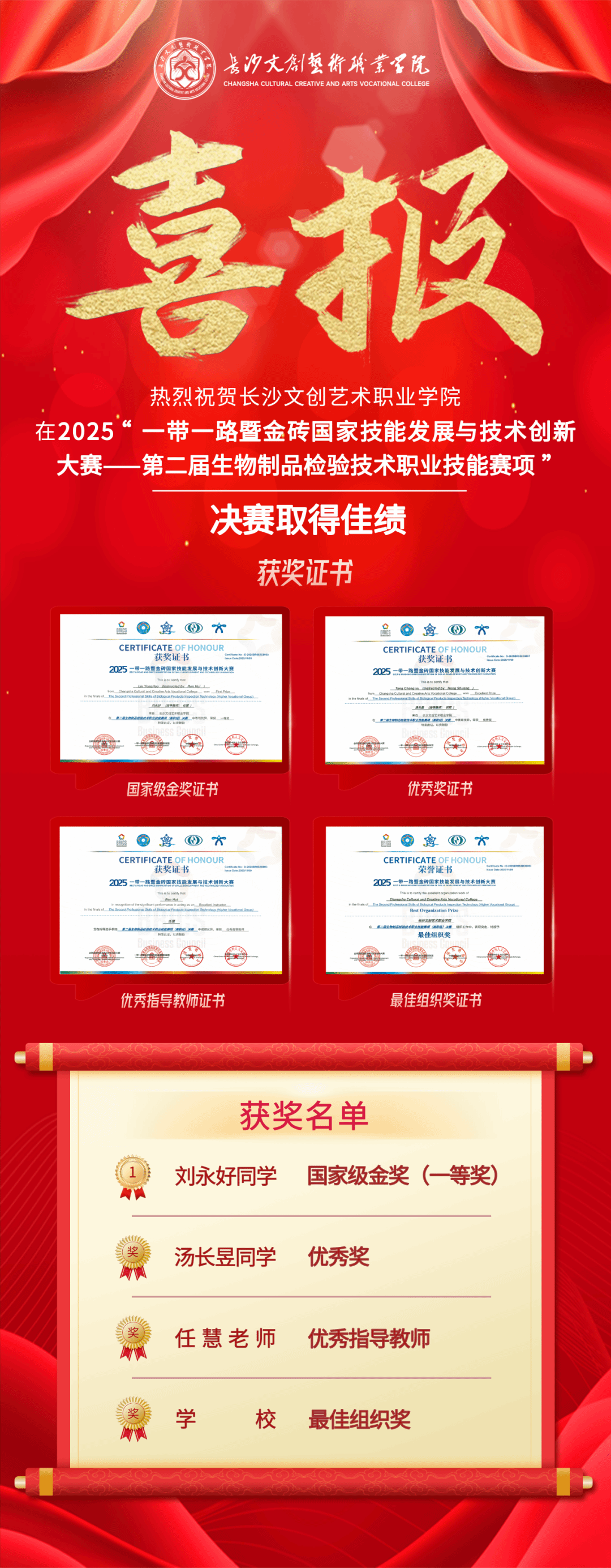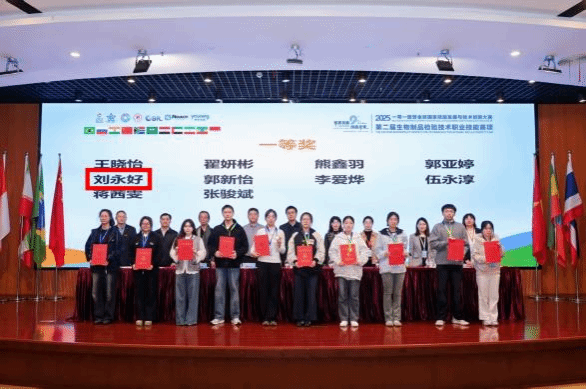 日前,2025年“一带一路”暨金砖国家技能发展与技术创新大赛——第二届生物制品检验技术职业技能赛项决赛在浙江经贸职业技术学院落下帷幕。我校药学专业2402班刘永好同学荣获国家级金奖(一等奖)、汤长昱同学获优秀奖,指导教师任慧获评“优秀指导教师”,学校荣获“最佳组织奖”!